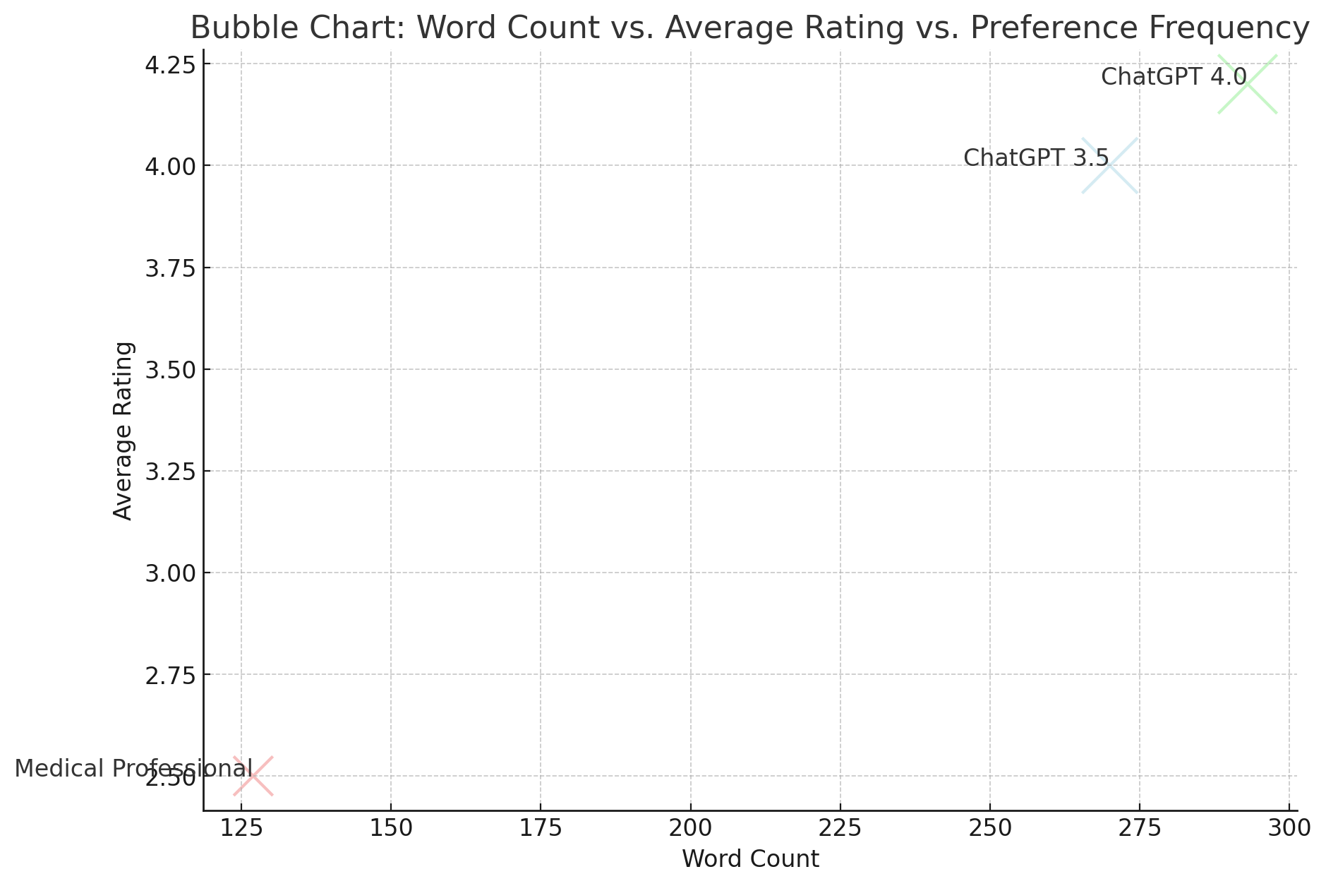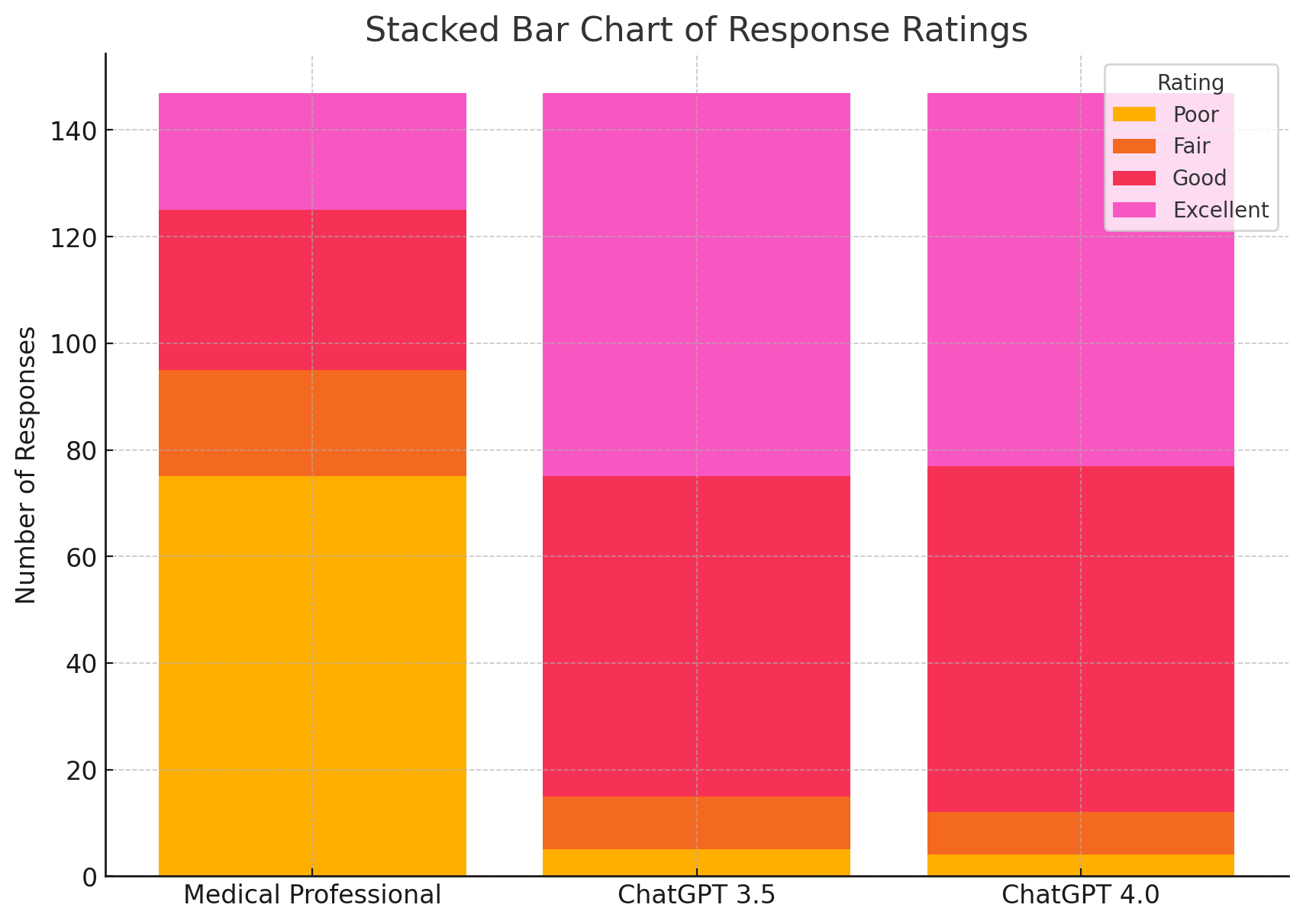 - While medical professionals’ responses were concise, they often lacked the depth seen in ChatGPT’s responses. This suggests that while brevity is valuable, especially in clinical settings, it may sometimes come at the cost of missing critical details that patients might find useful.