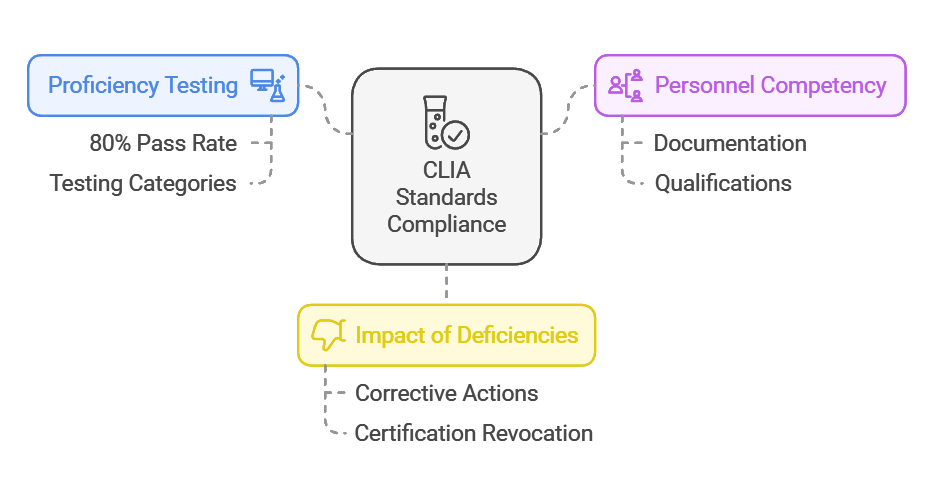 - Proficiency Testing: Laboratories must maintain a pass rate of at least 80% in proficiency tests for their testing categories to meet CLIA standards.