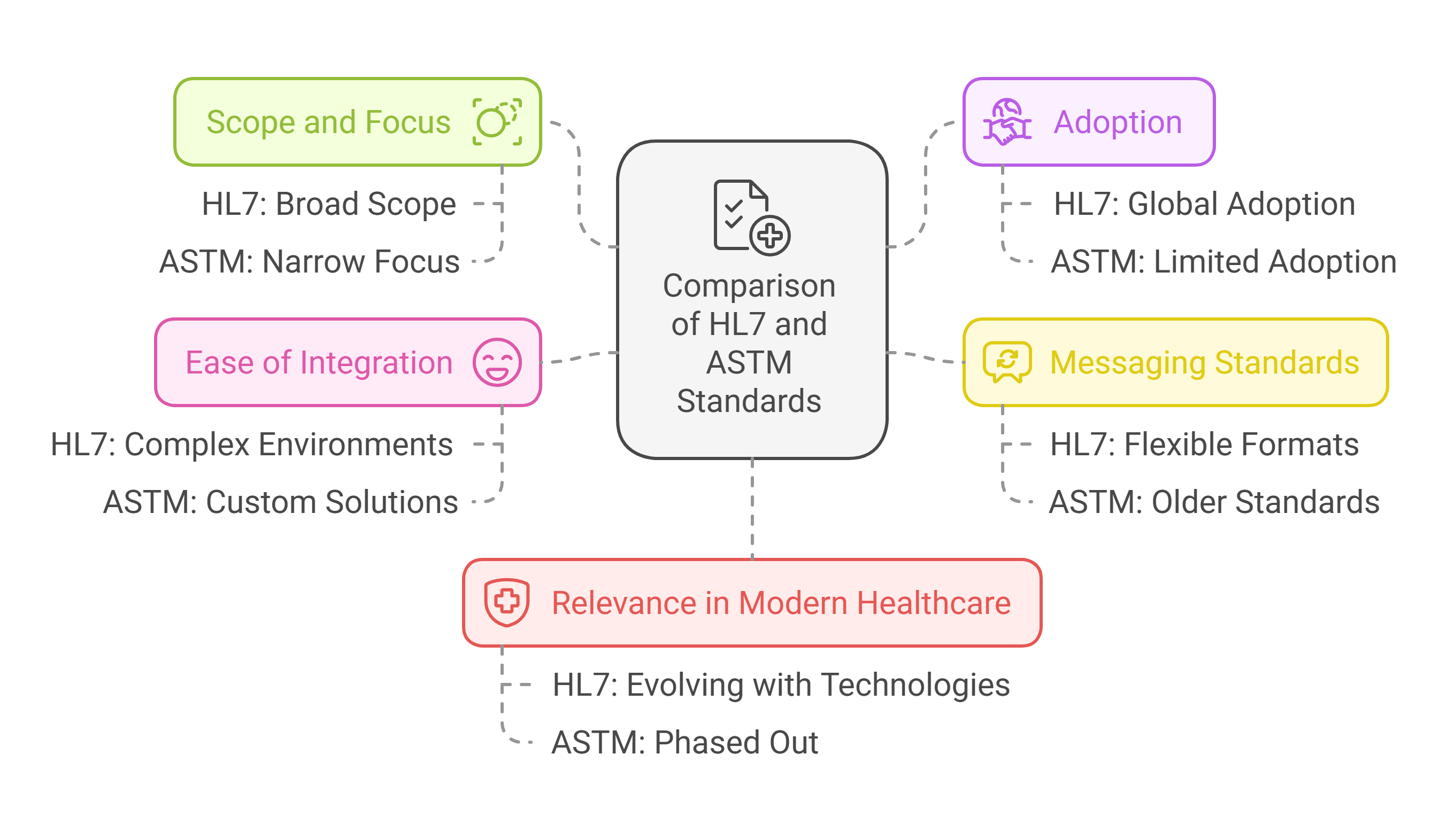 While both HL7 and ASTM aim to improve data exchange in healthcare, they differ significantly in terms of scope, adoption, and application areas. Below is a detailed comparison: